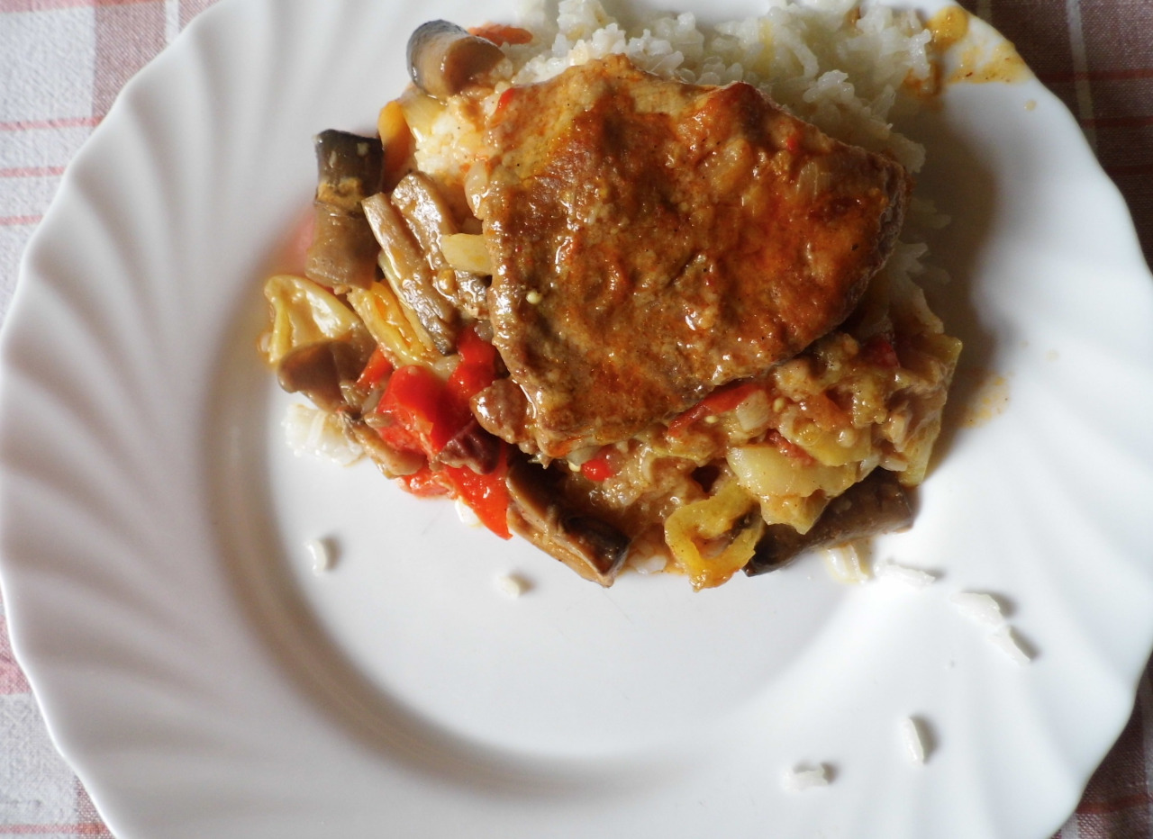 A feldarabolt hússzeleteket paprikás lisztben megforgatom, majd mindkét oldalát zsíron megpirítom. A megmaradt zsíron a hagymát megfonnyasztom, rárakom a hámozott, darabolt paradicsomot, majd a darabolt zöldpaprikát,padlizsánt,gombát. Egy kis ideig párolom, majd a feketeborsot és a pirospaprikát is rászórom. Jól összekeverem, az elősütött húst ráteszem, utánízesítek, és annyi vizet teszek rá, hogy a hús megfőhessen.